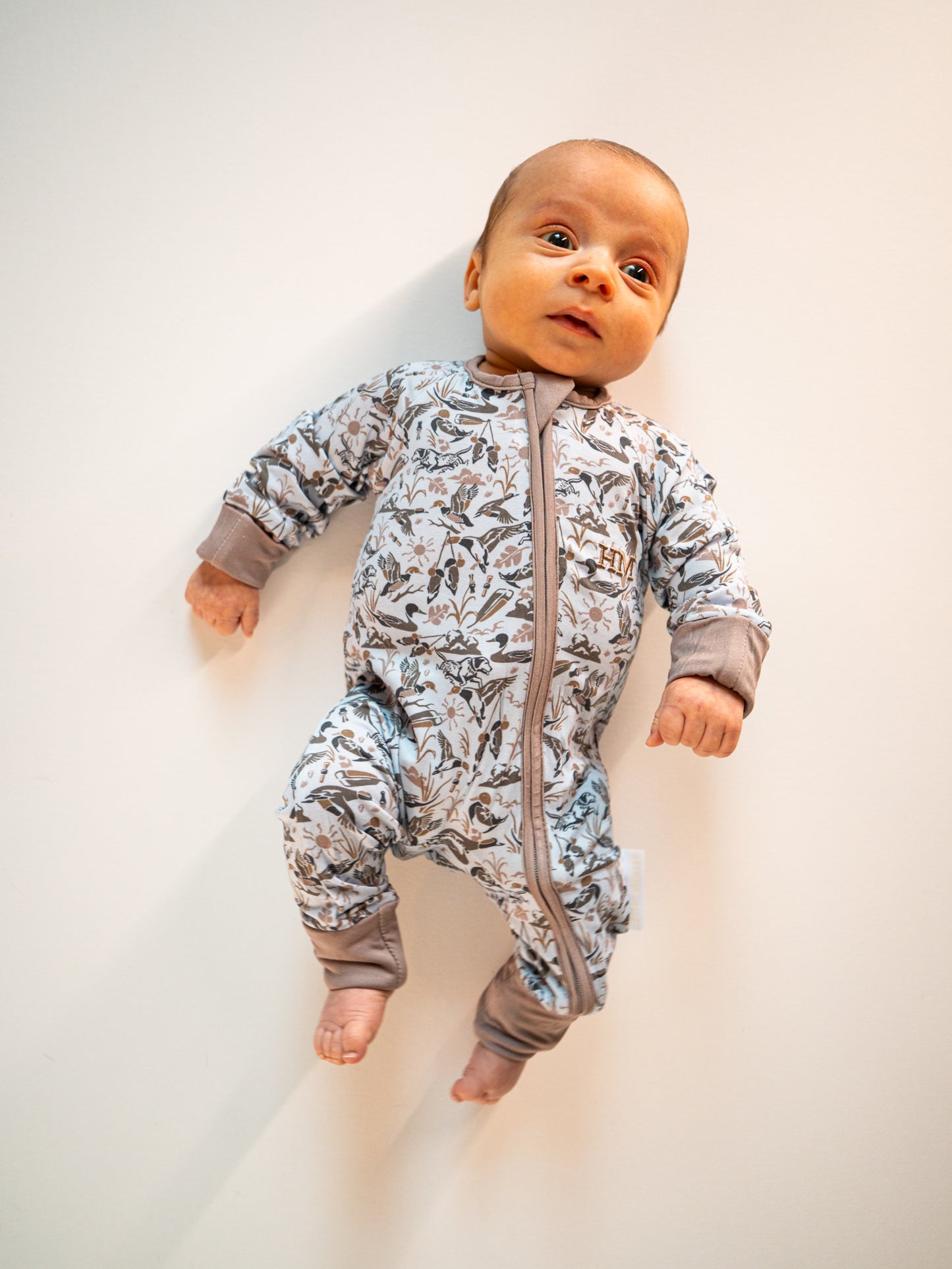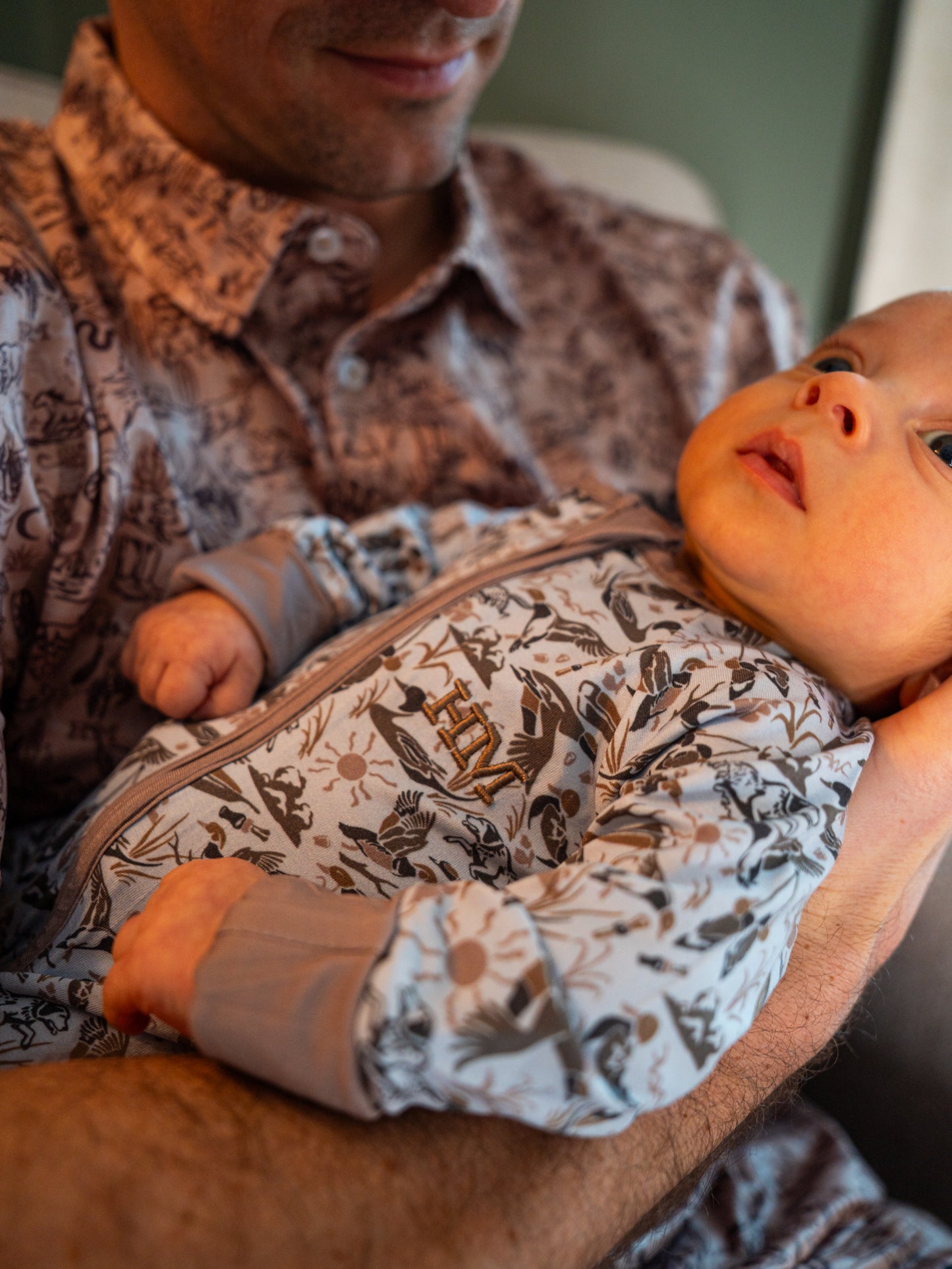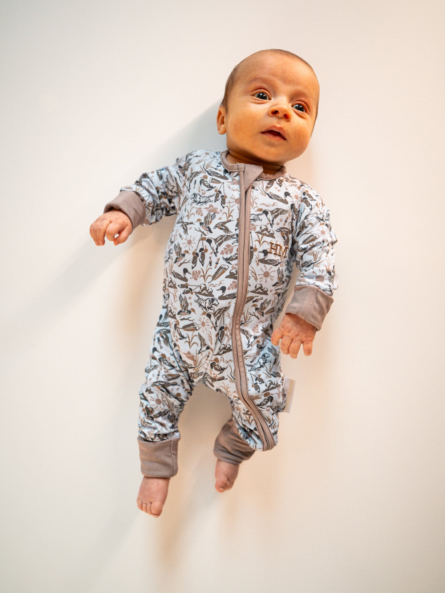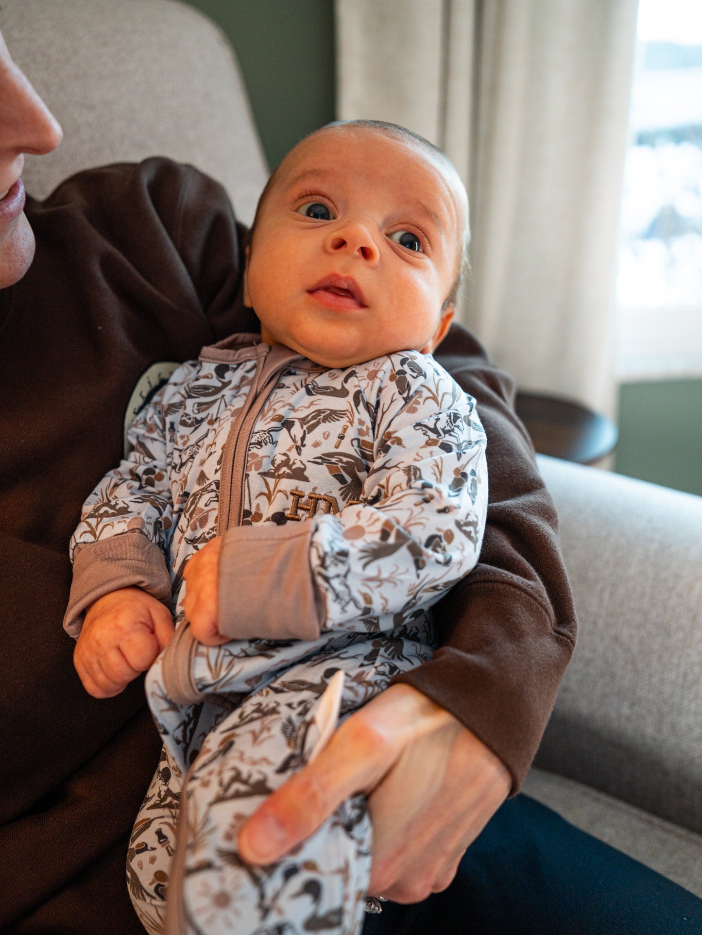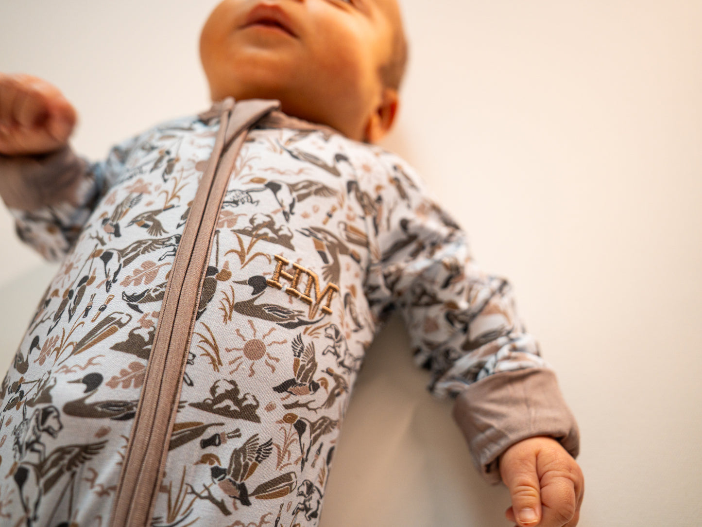 A sleeper made for your littlest duck hunter. This cozy bamboo spandex blend keeps your baby's temperature just right — cool when it's warm, warm when it's not. Fold-over cuffs at the feet and hands offer flexible comfort, and the full-length zipper makes diaper changes a breeze. With a playful duck print and all the right features, it's perfect for front porch naps, road trips to the duck lease, or cuddles by the fire.