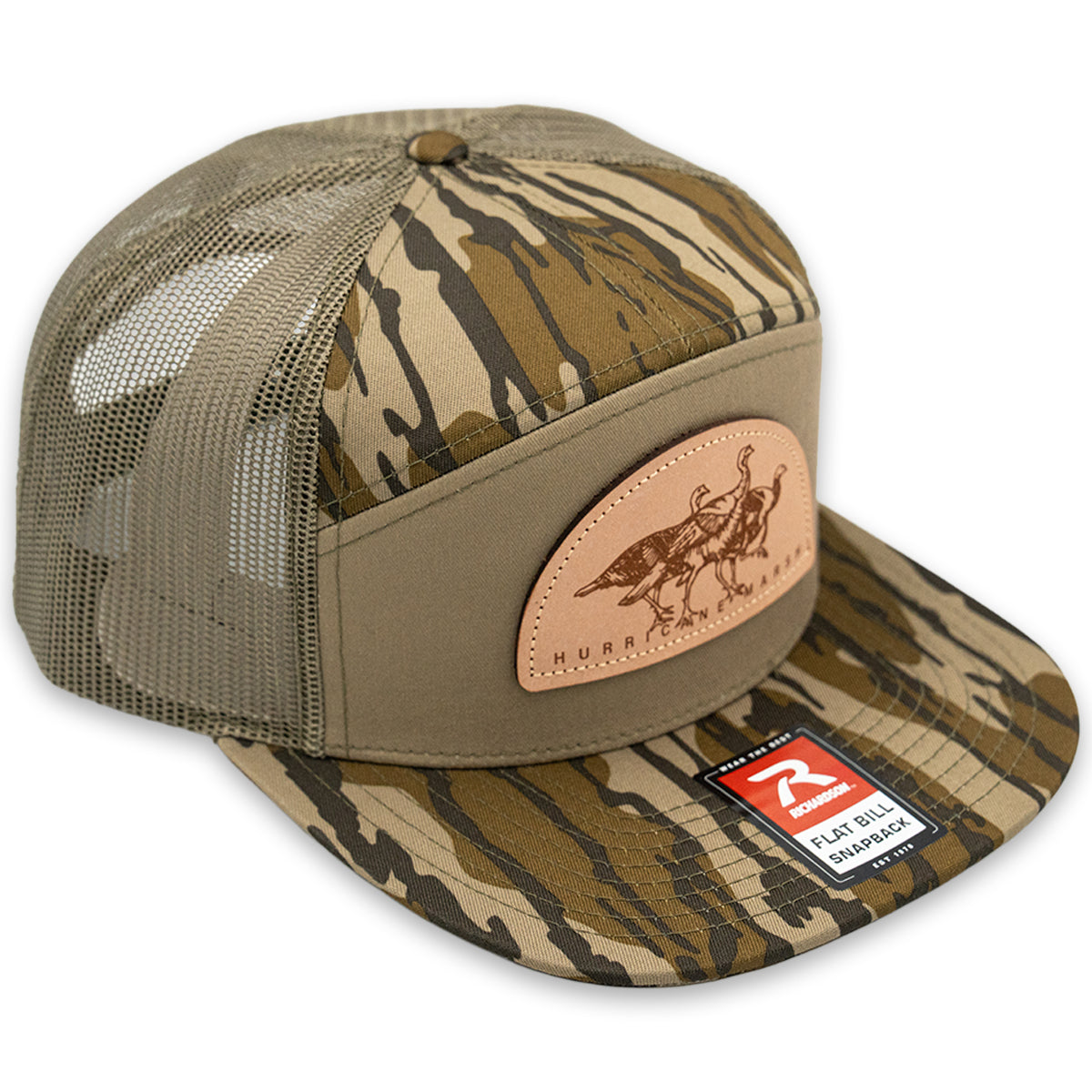 The Tres Pavos Richardson 7 Panel Hat in Mossy Oak Bottomland is made for spring mornings and long days chasing gobblers. Built on the premium Richardson 7-panel platform, it features a structured crown, flat bill, and breathable mesh back for a comfortable, dependable fit. This Mossy Oak Bottomland hat fits perfectly with your turkey hunting gear, while the genuine leather Tres Pavos patch showcases three strutting turkeys. Whether you're in the timber at daylight or grabbing lunch after the hunt, this is a turkey hunting hat that carries the lifestyle with it.