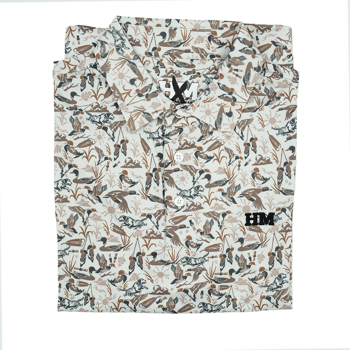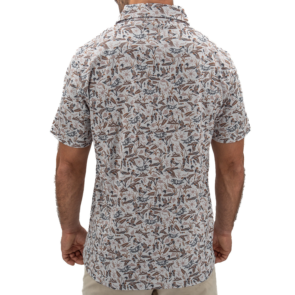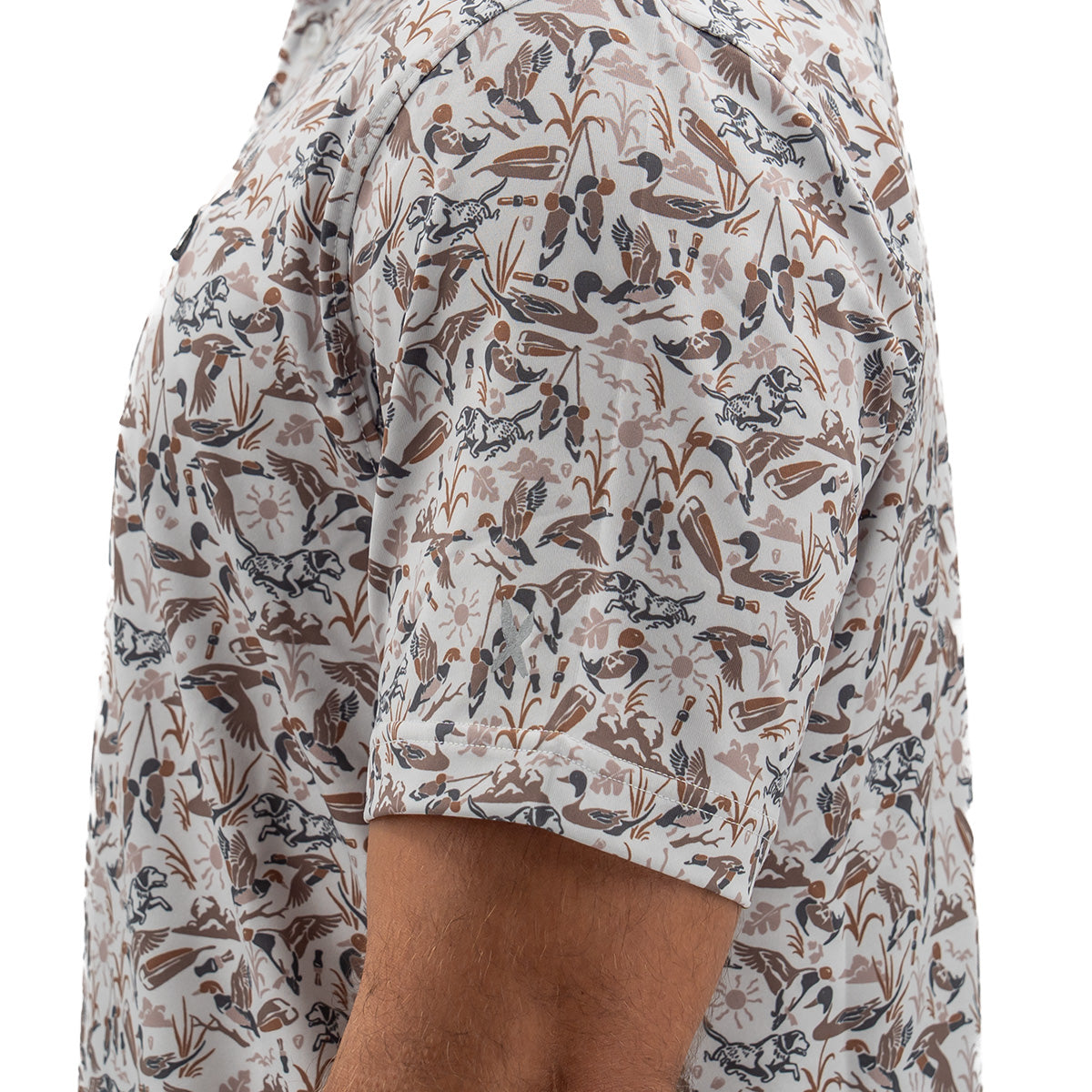 The Duck Club performance polo is a wardrobe essential for any duck hunter. When it's time to hang up the camo for a more classic look, this performance polo has your back. This classic design features all the things that cross a duck hunter's mind from duck calls, a labrador retriever, decoys, pintails, wood ducks, mallards, and more. With its four-way stretch, UPF technology, moisture-wicking capabilities, & anti-microbial features, this polo is ready for any adventure or even a casual night out.'