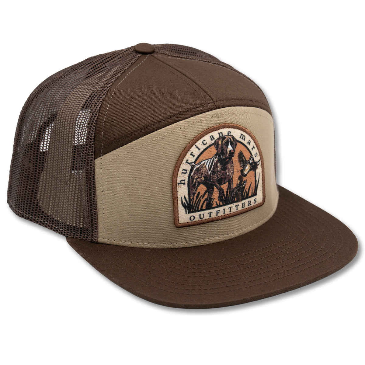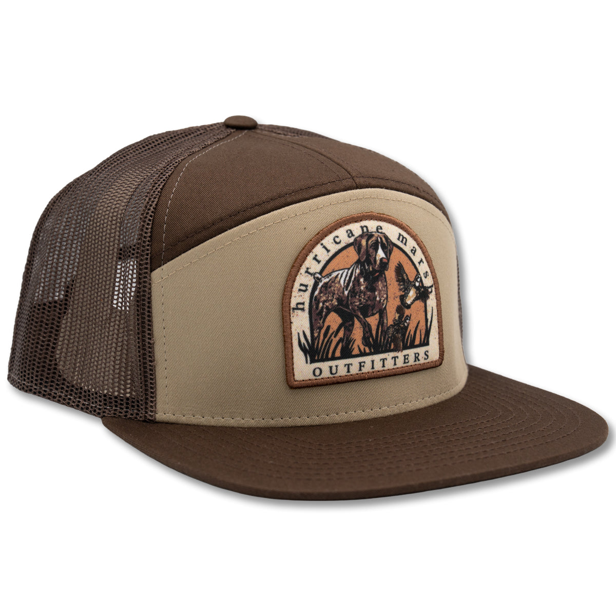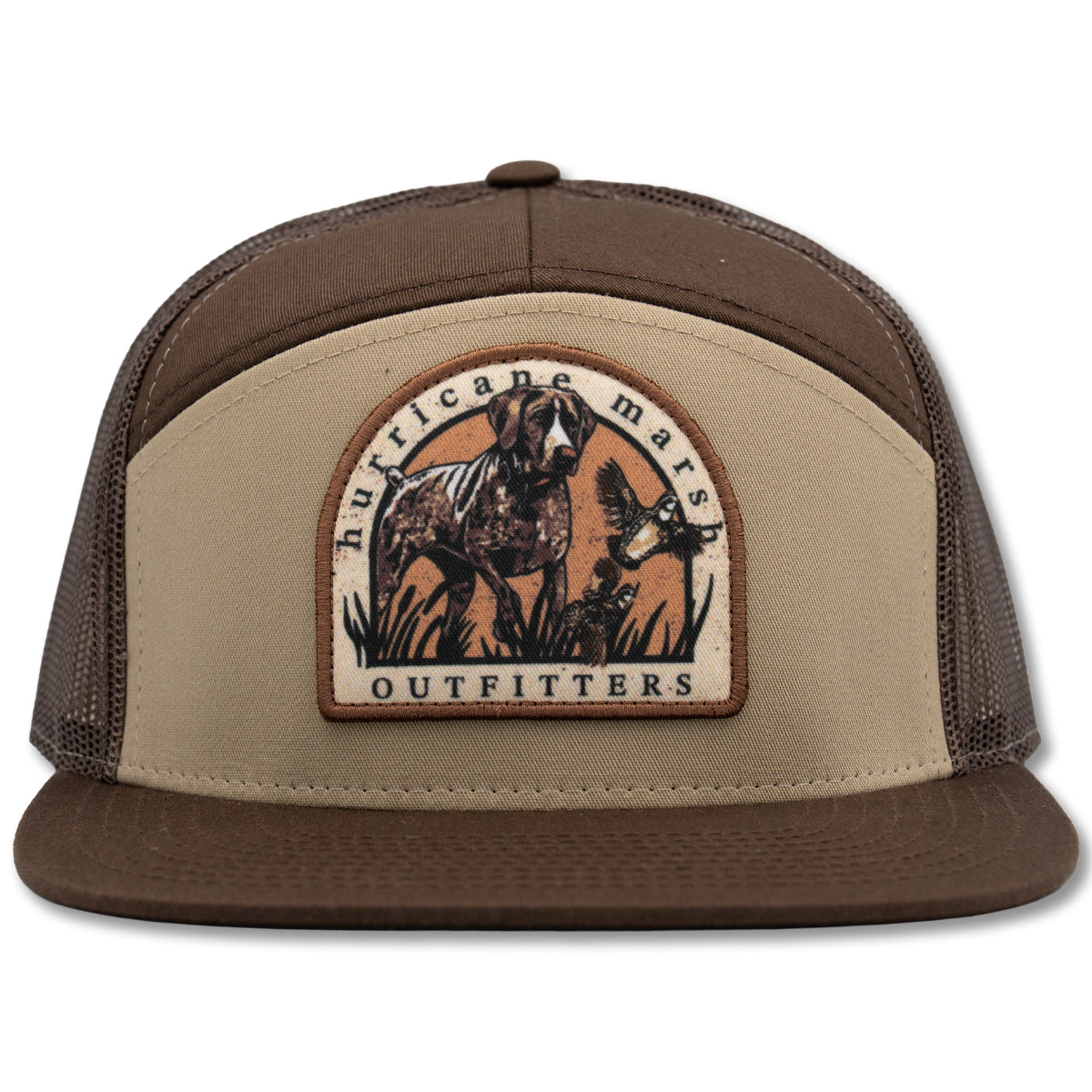 Meet our German Shorthaired Pointer Quail Hat—built on the Richardson 168 7-Panel for a clean, classic fit in brown/khaki. This upland hunting hat features a GSP locked on a covey of quail, perfect for anyone who loves bird dogs and the field. The structured 7-panel profile, breathable mesh back, and adjustable snapback make it comfortable all day—whether you’re scouting, working, or headed to town. Durable materials and timeless colors pair easily with any kit, while the detailed dog-and-quail artwork adds a refined nod to your passion. A go-to German Shorthaired Pointer hat and quail hunting cap for everyday wear, this Richardson 168 trucker brings reliable style and performance in one.